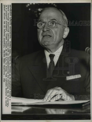 President Harry Truman as he appeared before a Senate Foreign Relations Subcommittee on revising the UN charter.
