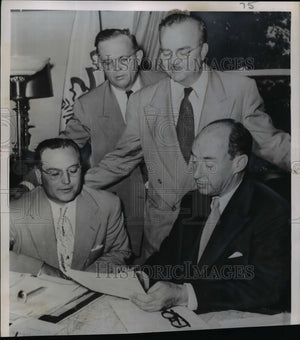 1952 Press Photo Adlai Stevenson Showing Some Papers To The Men Behind Him