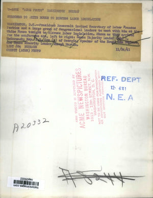 President Roosevelt invited Secretary of Labor Frances Perkins and a large group of Congressional leaders to meet with him at the White House. left to right: John McCormack, Rep. Cox, Rayburn, and Joseph Martin.