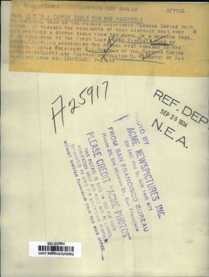 Miss Virginia Horn is addressing the parcel post package to Mrs. Roosevelt while President Goldman of Redwood Empire Association and Postmaster William McCarthy look on.