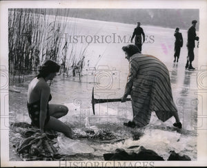 1950 Press Photo Women chop hole in ice for a swi as others skate - nep06828