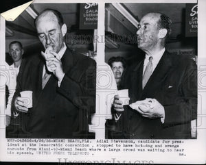 1956 Press Photo Adlai Stevenson Eating Hotdog in Miami Beach, Florida