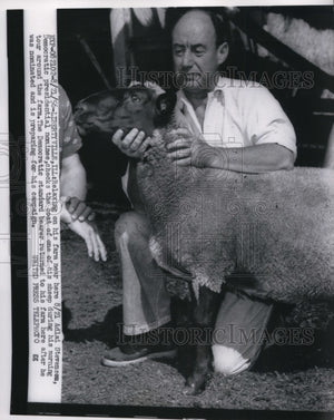 1956 Press Photo Adlai Stevenson Checks Coat of One of His Sheep on Farm