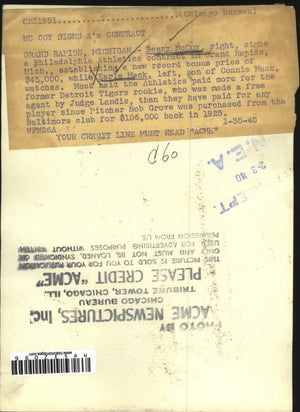 Benny McCoy signs contract with Philadelphia Phillies while Earle Mack looks on