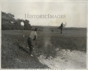 1932 Press Photo Golfer George Voigt hits out of trap at Timber Point Club