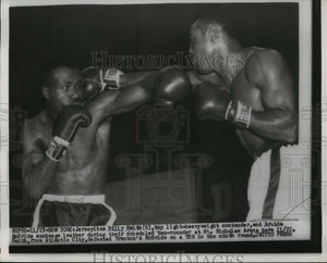 Billy Smith (R), top light-heavyweight contender, and Archie McBride exchange leather during their scheduled 10-rounder at St. Nicholas Arena. Smith, from Atlantic City, defeated McBride on a TKO in the 9th round.