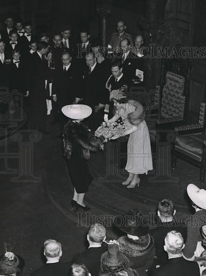 Credit - NEA Mrs. Ian Strachan, wife of the Liberal whip, in Parliament, was the first woman to be introduced to the Queen and she presented a bouquet to her Majesty who was seated on the throne in the Parliament building.