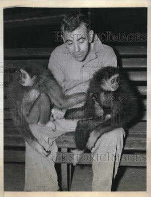 1944 Press Photo John Reagen holding Yogi and Sepoy, the male gibbons