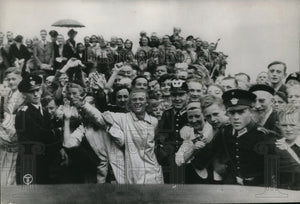 Kammersgaard, 17, Danish girl, has swum from Gedser, the most southerly point in Denmark, to Warnemunde, in Germany, across the Baltic Sea. The distance between the two points is 27 miles and Jenny covered it in 50 hours 59 minutes. At times during her attempt she had been carried far off her course by currents. Shown is the crowd greeting Jenny at Warnemunde.