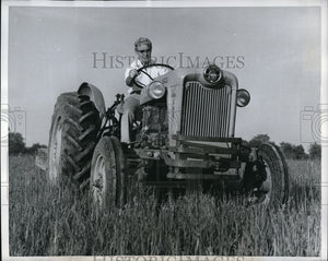 1959 Press Photo Mrs Lyon on a farm tractor in pastureland