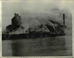 1932 Press Photo Fireboats pour water Ruins of Quincy Grain Elevator
