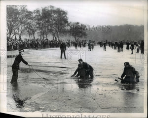 1950 Press Photo London Skaters Betty Dodd,Wm Sowan fell thru ice at Kingsmere