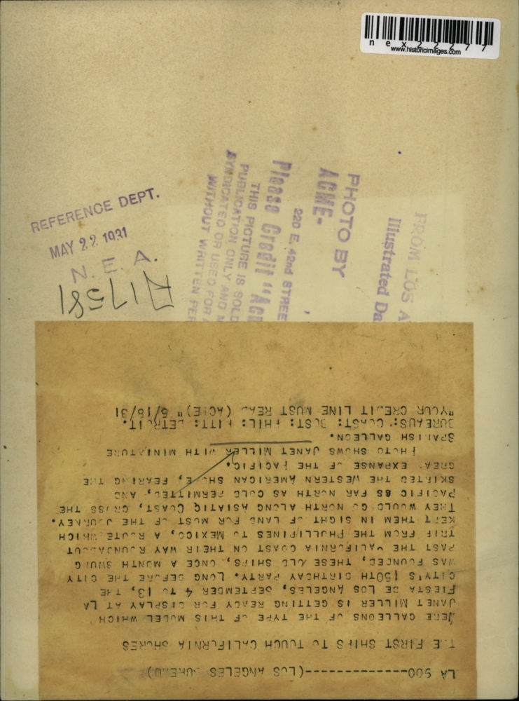 1931 Press Photo Janet Miller & miniature Spanish galleon in LA Calif