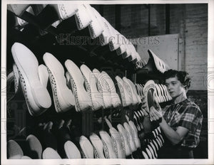 1957 Press Photo Betty Arrid, conveyor operator at the B.F. Goodrich Footwear