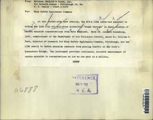 pollution scientists to breakthrough in their studies of carbon monoxide concentrations from auto exhausts. Shown Dr. Leonard Greenburg.