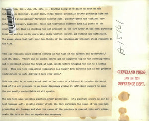 1951 Press Photo Indianapolis Ind Wilbur Shaw & new Firestone blowout safe tires