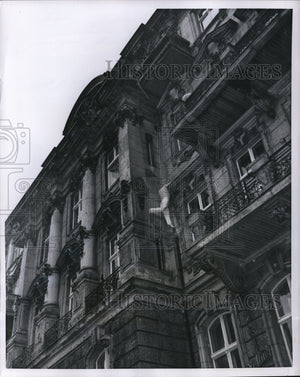1951 Press Photo Publicity Stunt Max Tullen from ledge to cornice to balcony