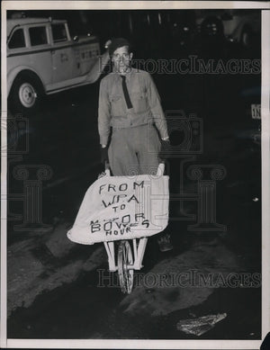 1937 Press Photo John Dale, pushing wheel barrow up the street