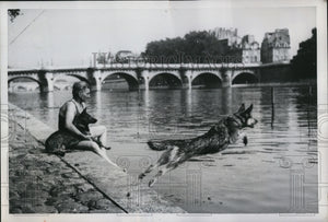 1952 Press Photo German Shepherd dog leaps into the Seine River in Paris France