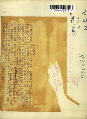 The mathematicians are at a two-week conference at Harvard University in Cambridge, Massachusetts to celebrate that institution's tercentenary. Shown is T.S. Fiske, (left), under the American Mathematical Society of Columbia University; and G.A. Bliss of the University of Chicago, as they attended the opening session, September 1st.