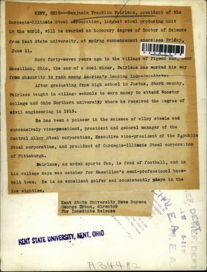 Benjamin Franklin Fairless, President of the Carnegie Illinois Steel Corporation will be awarded an honorary degree of Doctor of Science from Kent State University
