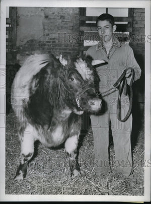 1943 Press Photo Grand champion Trump, Short-horn steer w/ owner Jack Talbott Jr