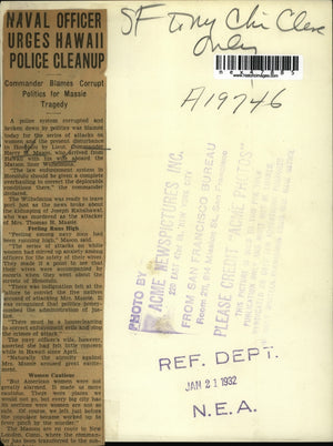 According to Lieutenant Commander Harry Mason, the police system corrupted and broken down by politics was blamed for the series of attacks on women and present disturbance in Honalulu