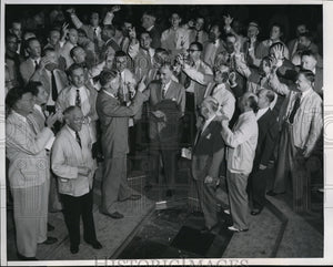 The Chicago Board of Trade initiated trading in soybeandeal future contracts, Photo shows (above) S.L. Meyers, 1st Vice President of the Board of Trade (left, center) and Richard F. Uhlman, former president of the board (right, center)