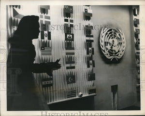 She is silhouetted against a familiar United Nations background of flags as she pauses to offer a prayer for peace.