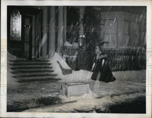 1944 Press Photo Solitary woman walks thru wind blown snow on a street