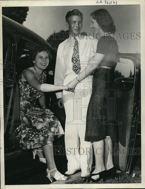 Pasadena, California - A pair of youthful "corrigans," Roderic Edson and Frances Lee Heck (left) both 20, who started out to a dance in Kansas City and wound up in Pasadena after driving steadily from the time they left their homes. Although it was romance that caused the unscheduled junket, it was not romance between Miss Heck and Edson, but between Edson and Betty Piper, 17, who left Kansas City four months ago with her parents to make her home here, Miss Heck, a friend of both, went along for the ride. She is expecting her mother, Mrs. Ross Heck, to take her home in a few days. Miss Piper is shown at the right as she welcomed the pair at her home.