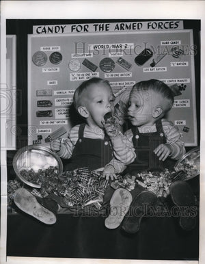 1947 Press Photo Twins Ronald & Robert Patterson Eat Candy Armed Forces Exhibit