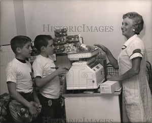 1955 Press Photo Charles Stack, Dean Sheridan, Mrs Lillian Polster & produce