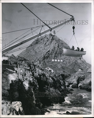 Boatload of Coast Guardmen returning from San Francisco, 20 miles away, are lifted ashore in an airborne taxi