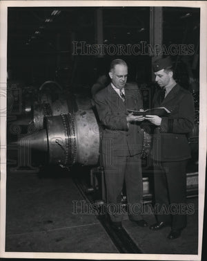 500th Westinghouse jet aircraft engine at Aviation Gas Turbine Division. In photo are William Anderson (L) division manager, turns the slim, high-speed powerplant over to Commander J.B. Meaking, the Navy's Bureau of Aeronautics representative at the plant