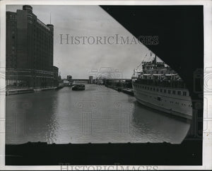 1949 Press Photo Chicago cargo & liner ship at docks in the port city