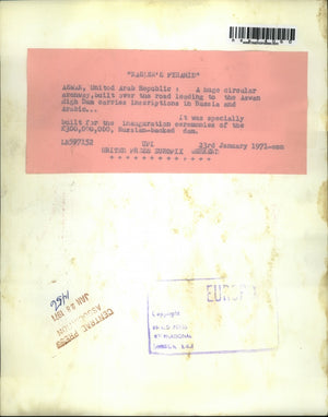 Huge circular archway in Aswan, United Arab Republic, built over the road leading to the Aswan High Dam carries inscriptions in Russia and Arabic.