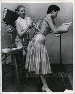 1956 Press Photo Rita Hackett glamor dress & a model sewn into it - nex84852