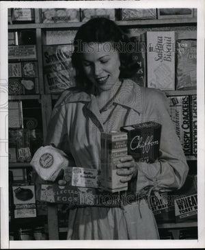 1947 Press Photo Cleveland Frances Kositzky at grocers with milk, butter & soap