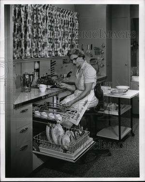 1956 Press Photo A hommemaker at kitchen sink with a dishwasher