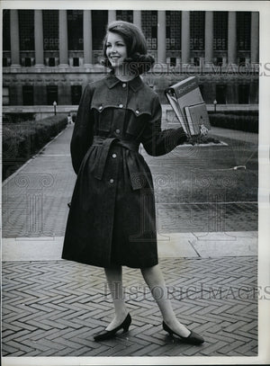 1962 Press Photo NYC Blue jeans look trench coat design by PRL - nex84982