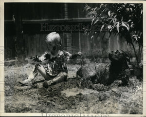1936 Press Photo Carolyn Strive of La Calif & her dog Pancho in mud - nex85775