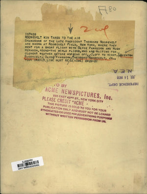Grandsons of the late President Theodore Roosevelt are shown at Roosevelt Field, New York, where they went for a short flight with Clyde Pangborn and Hugh Herndon, round-the-world fliers, who are waiting for clement weather before hopping off. Left to right are Quentin Roosevelt, Clyde Pangborn, Theodore Roosevelt, Jr.