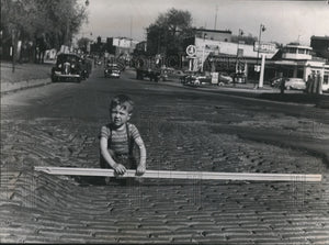 1958 Press Photo Allen Case Plays on Cobblestone Old Bellevue Main Street Ohio