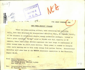 1962 Press Photo Rectifier Cell Pillars International Rectifier Corp El Segundo