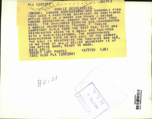 London businessmen who find they need a part-time secretary or additional office help in a hurry can phone a unique London secretarial agency and get what they need. The Challoner Service has inaugurated a mobile secretarial "patrol." Twelve competent girls tour the West End, City and Westminster areas in a small bus equipped with a radio-telephone. The shorthanded businessman puts in his call to the agency. The call is relayed to the cruising bus and, in no time at all, a relief secretary is at the office door, ready to work.