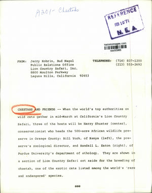 1971 Press Photo Cheetahs at California's Lion Country Safari Director R Eaton