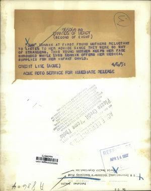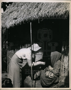 "Jam" Monnik of United Nations International Children's Emergency Fund, World Health Organization, at first found mothers reluctant to listen to her advice since they were so shy of strangers. This young mother keeps her face shrouded while Miss Monnik offers her medical supplies for her infant child.