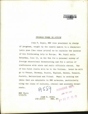 Mr Royal will sail for Europe on the Rex for a personal survey of foreign educational broadcasting and for a series of conferences with state and radio officials abroad. One of his first visits will be to the Vatican. Later, he will go to France, Germany, Russia, England, Sweden, Denmark, Austria, Switzerland, and Poland. Royal is seeking new ideas that are adaptable to NBC networks, particularly along the lines of cultural, ethical and academic broadcasts.
