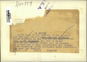 in Los Angeles, California, Mrs. Ida Lee Drummond is shown as she visited her son, Karl Allen Drummond, 21, who is being held in Los Angeles County jail on charges of attempting to sell photographs and information regarding naval airplanes under construction near Los Angeles.